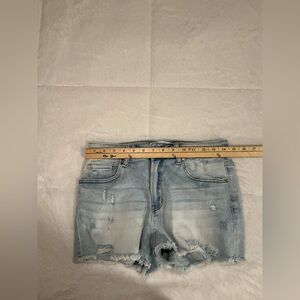 Chic and casual denim shorts. Features a faded blue wash with distressed details. Perfect for everyday wear. Never worn. Very stretchy.