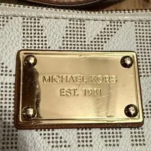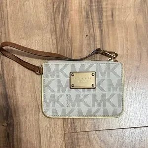 Chic wristlet with signature MK pattern. Features gold-tone hardware and tan strap. Perfect for essentials.
