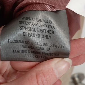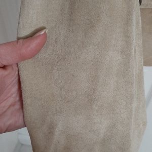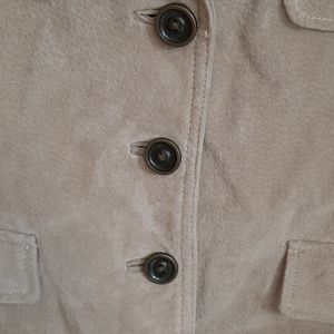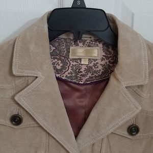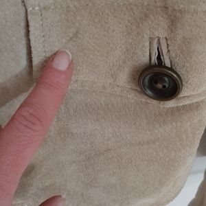 Soft suede jacket from Wilson's Leather company. Neutral tan to match anything. 4 functional button closed pockets on front. Fully lined. Western style fit. Button accents on sleeves. Jacket and lining are free from holes. There are some stains including: marks in sleeve and one front pocket appearing to be from where the buttons rub (not too noticeable), one med size noticeable stain to hem on front, and one small pen mark on sleeve cuff. Womens size S. 18 bust. 15.5 shoulders. 21.5 length