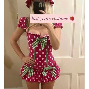 Tags: polka dot, dots, ruffle, raspberry, costume, cosplay, Halloween, sexy, Y2K, bows, gingham, ric rac trim, fruit, berries, fitted, tight, short, strawberry shortcake look