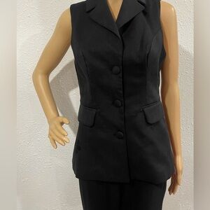 Chic black sleeveless blazer top. Features button closure and notched lapel. Perfect for a stylish look.