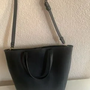 This elegant black tote from Victoria's Secret features a classic trapezoidal shape, perfect for both casual and formal occasions. Crafted with a subtle textured finish, it offers dual short handles and an adjustable shoulder strap for versatile carrying options. The sleek design and high-quality material make it a stylish and practical choice for everyday use.