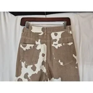 The 12th Tribe Women's Designer Midland Cow Print Wide Leg Jeans XS are a stylish and unique addition to any wardrobe. These jeans feature a striking animal print cow pattern in white, a high-rise fit, and a comfortable cotton blend fabric wash. With a wide-leg style and pockets for added convenience, these jeans are both fashionable and practical. The zip and button closure ensures a secure and comfortable fit, making them perfect for everyday wear.