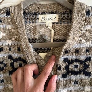 Stylish knit fairisle cardigan in a size small. Sweater is brand new and never worn. Bust is 20 inches and length is 19 inches. Got this as a gift so not sure where it was purchased. Looks similar to Sezane or Anthropologie so listing under Anthropologie for exposure. Very soft and warm.