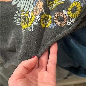 Stylish crop top with Edinburgh graphic and colorful design. Features a unique print with wings and flowers. Cropped by hand, but crop is clean.