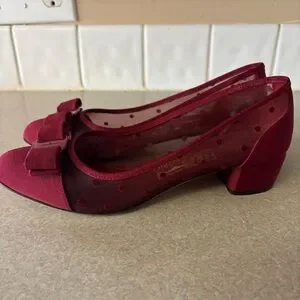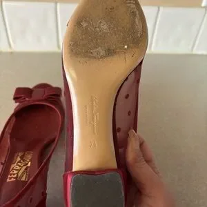 A pair of mesh polka dot pumps from Ferragamo. Bow with logo. Some wear on the sole as shown. Size 7.5.