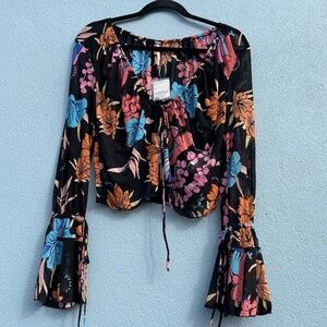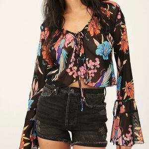 Free People Floral Print Of Paradise sheer bell sleeve tropical top black fairy