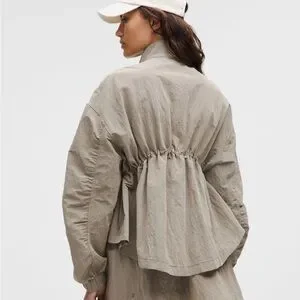 Lululemon “crinkle nylon cinchable jacket” in warm ash grey color; voluminous and lightweight with a bungee cinch waistline, high low hem and ruched sleeves; water repellent textured nylon material; 2-way zipper