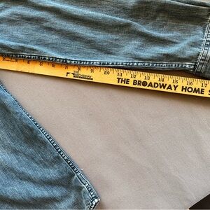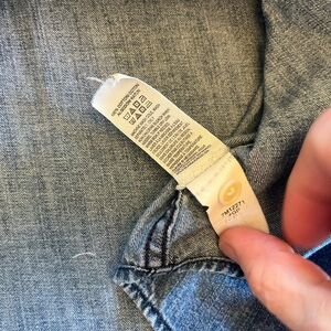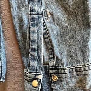 Western Style Classic Fit denim shirt with pearl snap button-down design. Features chest pockets. Ideal for casual wear. Slight imperfections noted in photos, but adds to the comfort and lived in nature of the shirt.