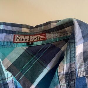 Stylish plaid shirt for kids. Features a mix of blue and green tones. Perfect for casual wear.