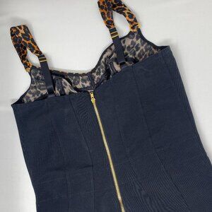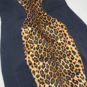 A bombshell dress in a figure-hugging cut. Featuring a smooth, silk-satin leopard print panel at the centre front, with three-part wired cups for support and uplift. The semi-sheer side panels are crafted from black powermesh, with seam details and a flattering waistband.