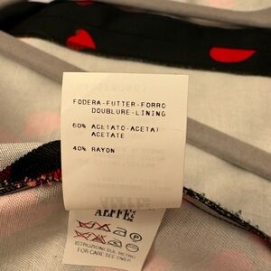 Perfect for Valentine’s Day! This vintage Moschino Cheap and Chic black jacket featuring a bold red heart design with matching silk mini skirt is from the mid 1990s.
