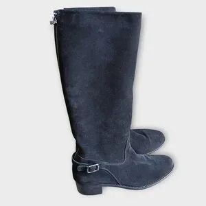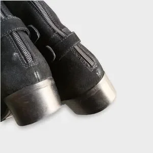 Chic black suede boots with buckle and back zipper. Lighting makes the color appear lighter/faded than true deep black color.