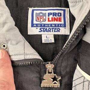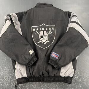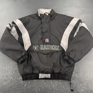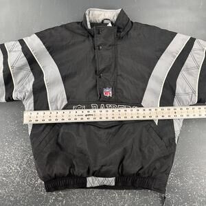 Vintage Raiders Starter jacket in men's large size. Features a black and gray striped design with the iconic Raiders logo prominently displayed on the front and back. This 1/4 zip pullover jacket is part of the Pro Line Authentic collection. Constructed from a durable fabric blend of 100% nylon shell and 100% polyester lining for comfort and longevity. Elastic cuffs and hem provide a secure fit, while the snap and zipper closure ensure easy wear. Perfect for fans seeking a stylish and authentic NFL outerwear piece. minimal discolorations on seams and embroidery, a good Wash will take care of that....