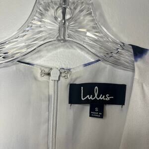 Lulus dress, Lulus small dress, floral A-line dress, sleeveless V-neck dress, white blue print dress, summer party dress, wedding guest dress, cocktail dress, fit and flare dress