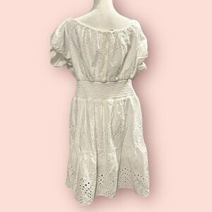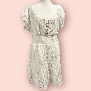 Very nice dress. Eyelet lace over white slip lining. Can be worn on or off shoulder. Color is white white, which is hard to show in the photos. Elastic waist, tie corset style front. Measures approximately when flat: pit to pit 20 inches, non-stretched waist 16 inches, length from waist to hem about 22”.