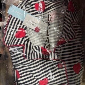 Stylish black and white striped pajama set featuring pink heart accents. Comfortable and chic for lounging.