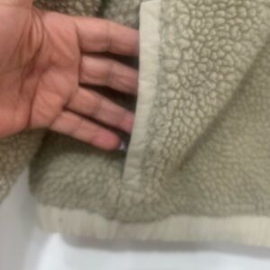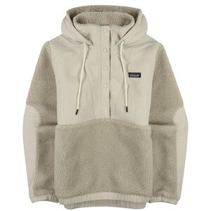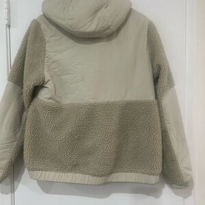 Warm tan fleece hoodie with button-up front. Includes drawstrings for adjustable fit.