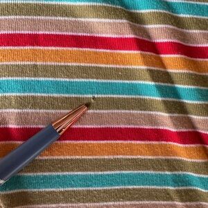 Very cute vintage striped top featuring white ribbed lining around arms and neck and a v neck in both the front and back. Please see all pictures and check measurements and please note a tiny hole on the back, as pictured. Other than that, the top is in good gently used condition.