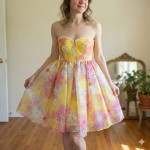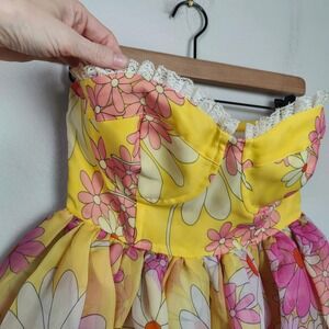 Selkie Corset Puff Dress Womens XS Yellow Pink Floral Mini Romantic Rococo Girly