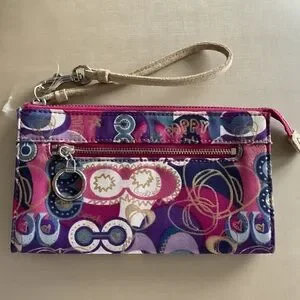 Vibrant Coach wristlet with abstract patterns. Features a secure zipper and wrist strap. Perfect for essentials. y2 k poppy coach. Guaranteed authentic . Approximately 7.75”: x 4.5”. In excellent condition.