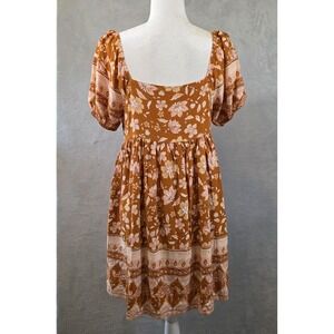 Pink Lily Dress Womens Medium Rust Floral Babydoll Mini Puff Sleeve Square Neck