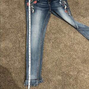Stylish blue jeans with vibrant floral embroidery. Features a flare and wide leg cut.