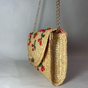 Chic straw clutch featuring vibrant red floral embroidery. Perfect for adding a touch of elegance to any outfit.