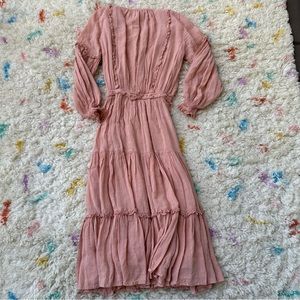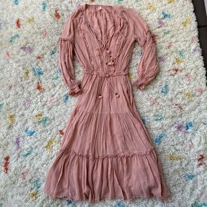 Effortlessly elegant in "Musk", a barely blush tone with a hint of gold Lurex threading throughout, features a full elastic drawstring waist finished with antique brass beaded tassle ties, elastic cuffs and shirring detail on the sleeves, relaxed silhouette in fine Rayon with a three cascading tiers in front and a back yolk paneling detail. Fully lined. Mesmerizing with an unassuming beauty. Like new condition.