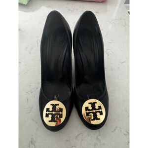 Tory Burch Black Leather Ballet Flats Gold Logo Medallion Size 8 (Flawed)