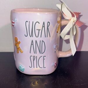 Charming Rae Dunn mug with 'Sugar and Spice' text. Features playful gingerbread and candy designs. Perfect for cozy drinks.