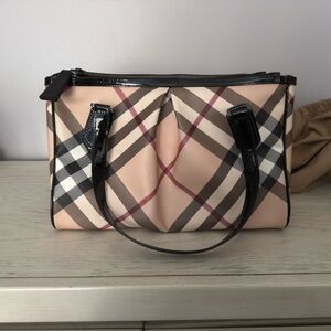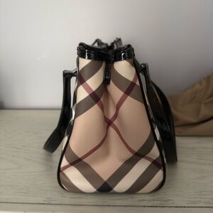 Stylish Burberry shoulder bag with iconic checkered pattern. Features shiney black leather handles and tan accents. Perfect for versatile use. Minor wear pn bottom of purse as pictured.