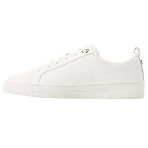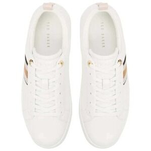 Keywords: Ted Baker sneakers, leather sneakers, low top, white sneakers, striped detail, rose gold, designer sneakers, casual shoes, athleisure, everyday wear, fashion sneakers, womens footwear, comfortable shoes