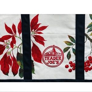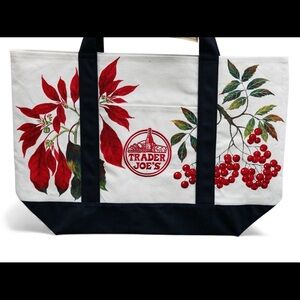 Brand-new Trader Joe’s large canvas tote bag featuring a hand-painted Christmas design with red leaves and festive berries. Painting is on one side only and is washable with regular detergent. Due to the hand-painted nature, each bag is slightly unique. Durable, reusable, and perfect for holiday gifting or daily use.