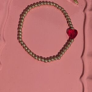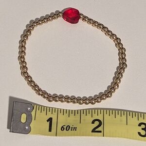 Gold beaded stretch bracelet with red heart gem charm accent.