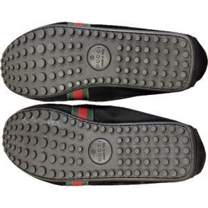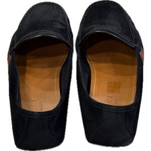 Authentic Gucci penny loafers crafted in soft black suede, featuring the iconic green and red Web stripe detail at the sides. Classic penny keeper strap across the vamp with moc-toe stitching and a timeless, understated luxury silhouette. Made in Italy. A versatile designer loafer suitable for both casual and elevated wear.