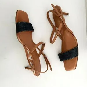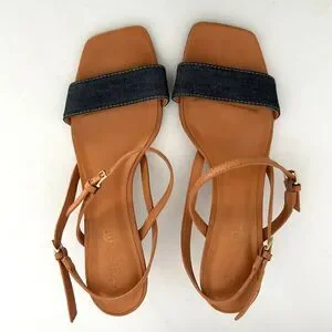 Details: A denim strap enhances the casual-chic attitude of a go-to sandal grounded by a comfort-cushioned footbed featuring a2" heel, an adjustable ankle strap with buckle closure; hidden elastic inset, a cushioned footbed with arch support, leather and textile upper/leather lining and sole