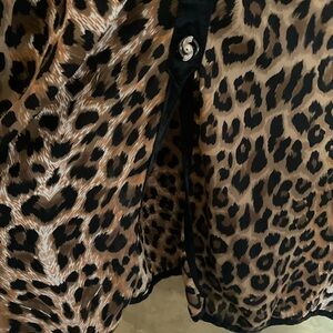 Beautiful vintage leopard print chiffon longline blouse in a relaxed, slightly oversized fit. Satin collar and accents with ornate buttons. Buttons about 2/3 of the way down and then has a flyaway style. Size tag has faded.