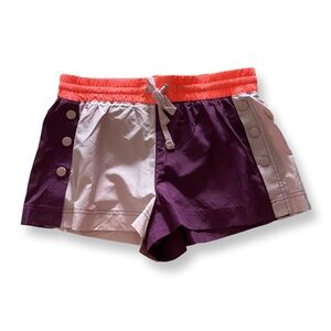 Get a little sporty in these so fun color blocked active shorts featured in drawstring style with so cool snap buttons on the side and a vented hemline. Pull on style, back button pocket, mid rise, built in under shorts and two side pockets. NWT