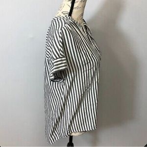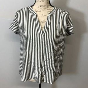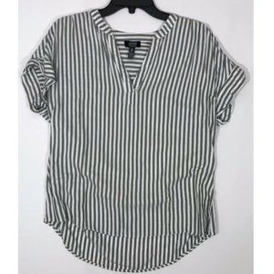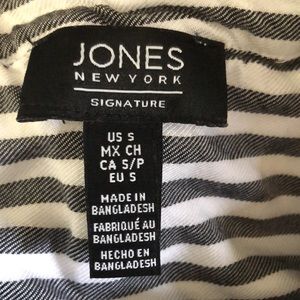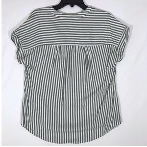 Used, good condition. Jones new york women's gray and white striped short sleeved blouse shirt.