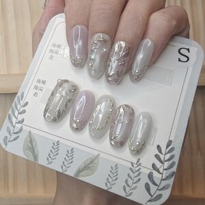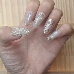 Enhance your style with this elegant pearl nail art set. Featuring a blend of cream and gold tones, these nails offer a sophisticated look. Perfect for any occasion.