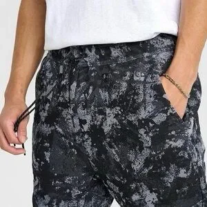 Bold patterned men’s joggers pants in black and gray, with pockets on the sides, elastic waist, and waist adjustment straps. Ideal for casual wear or workouts. Comfortable fit. Medium