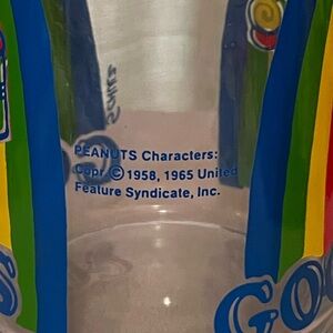 Clear vintage 1960s glass jar featuring Peanuts’ Snoopy and Woodstock and a colorful rainbow design. Ideal for storing goodies!