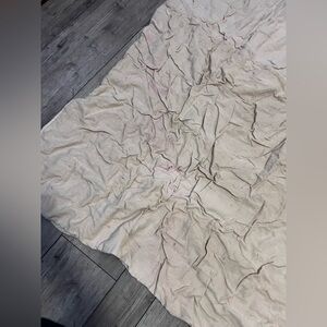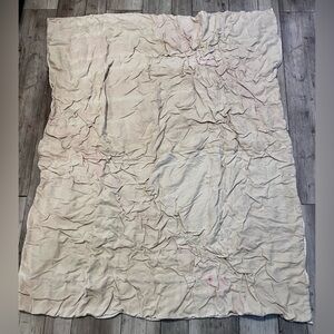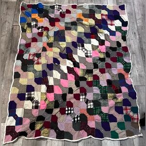 Beautiful, intricate patchwork quilt. Handmade, with a tan/cream backing. Wool fabric throughout.