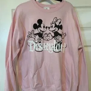 Charming pink sweater featuring Mickey and Minnie. Soft and comfortable. Perfect for Disney fans.