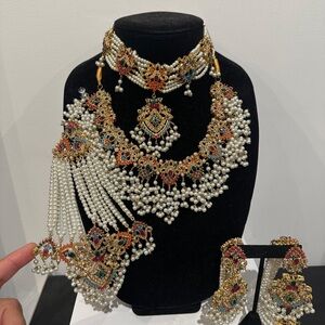 Stunning necklace set with gold accents and pearl embellishments. Features intricate design with colorful details. Perfect for elegant occasions.
