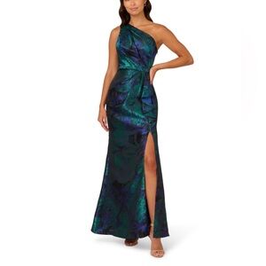 Adrianna Papell One-Shoulder Jacquard Cocktail Dress – Emerald & Navy Metallic – Draped Ruffle Front – Formal, Wedding, & Holiday Size 14