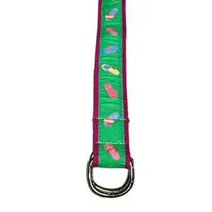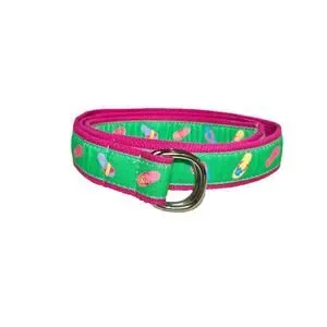 Preston canvas belt featuring a colorful flip flop print on a green canvas with bright pink trim. Designed with an adjustable double D-ring closure, this lightweight belt is perfect for summer outfits, resort wear, beach days, and casual layering over dresses, tunics, or denim.