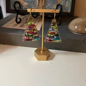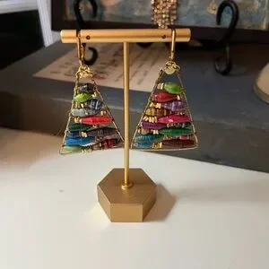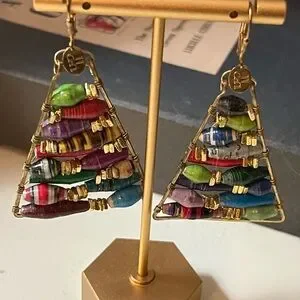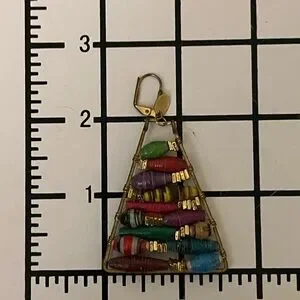 This earring set is handmade with wire-wrapped paper bead triangle earrings, often associated with designs popularized by Anthropologie. They feature colorful, rolled paper beads of varying sizes arranged within a brass or gold-toned wire frame. Add a pop of color to your outfit with these vibrant beaded triangle earrings. Perfect for any occasion. See pics for approximate measurements