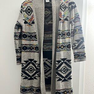 Stylish open cardigan with tribal patterns. Features black, gray, and multicolor designs.
